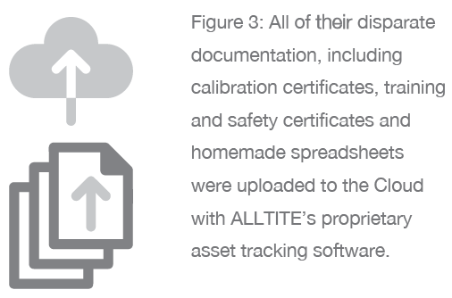 All the calibration certificates. asset lists, safety certificates and documentation were linked to a QR code. In the field, these were printed on a label attached to the field technician's hard hat and ID badge. Grouping the tools by QR code assigns accountability to each field technician. A customer or auditor can snap the QR code from a smartphone to quickly retrieve all the compliance documentation, as well as the tool list that the technician is responsible for, and email or text it to whoever wants it.